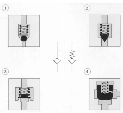 單向閥(止回閥)的主要功能是在一個(gè)方向阻止油液的流動(dòng),而在反方向則實(shí)現(xiàn)自由流動(dòng)。阻止流動(dòng)必需無(wú)泄漏,因而這類閥總是采用座閥結(jié)構(gòu)。密封元件有鋼球(1),錐閥芯(2),閥座(3)和插裝閥(4)幾種類型。只需很小的液壓力,密封元件就可克服彈簧力而開(kāi)啟閥門。(見(jiàn)圖一)
