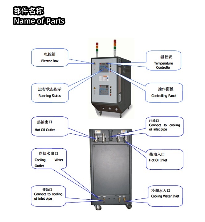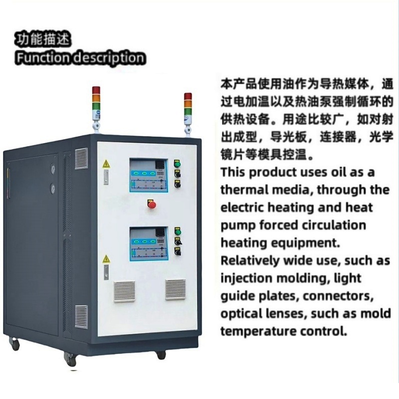 本產(chǎn)品使用油作為導(dǎo)熱媒體,通過電加溫以及熱油泵強(qiáng)制循環(huán)的供熱設(shè)備。用途比較廣,如對射出成型,導(dǎo)光板