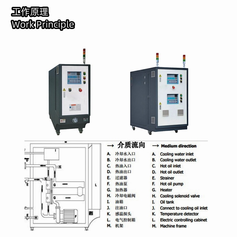 傳熱媒體(油)通過 I(油箱)進(jìn)入系統(tǒng),由 F(循環(huán)油泵)打到模具后再回到系統(tǒng),周而復(fù)始。媒體(油)在經(jīng)過 G(加熱器)