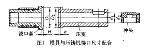壓鑄機(jī)的壓室與壓鑄模具接口尺寸如圖1所示。圖中的D2、h為壓鑄機(jī)的接口尺寸,每個(gè)壓鑄機(jī)廠家都有自己的標(biāo)準(zhǔn),但并不一定適用于所有的壓鑄企業(yè),為達(dá)到后續(xù)生產(chǎn)中快速模具更換的目的,每個(gè)壓鑄企業(yè)就需要對(duì)此尺寸進(jìn)行有效的整合,確保在生產(chǎn)中當(dāng)部分設(shè)備出現(xiàn)故障時(shí),現(xiàn)有的模具能夠快速地更換到其他設(shè)備上,不會(huì)因?yàn)樵O(shè)備接口尺寸的差異造成現(xiàn)有的模具無(wú)法在其他設(shè)備上進(jìn)行生產(chǎn)。