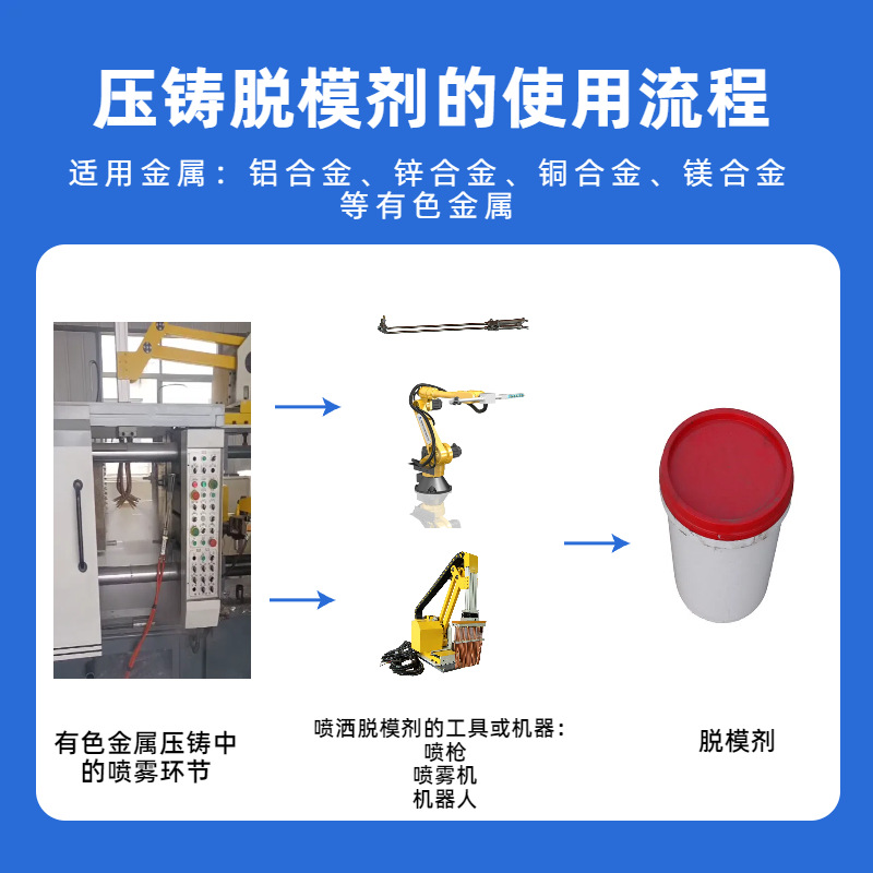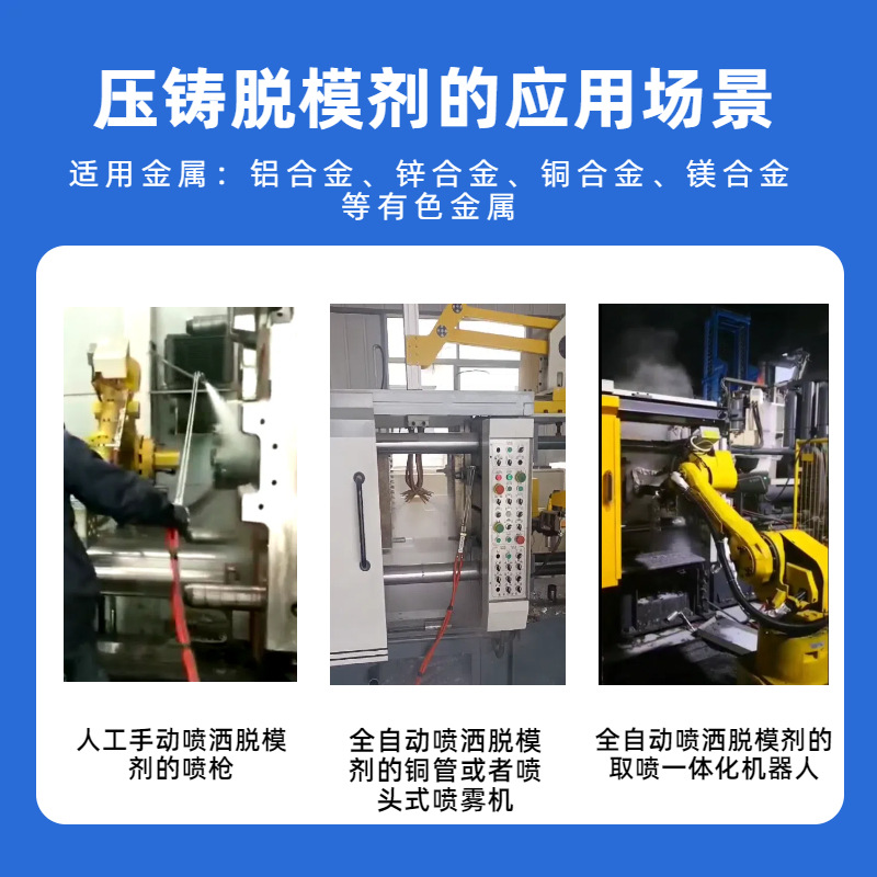 高溫濕潤性,潤滑性能好,分離脫模能力強,對深腔細長芯,多向軸芯投影面大等壓鑄模具具有優(yōu)越的脫模效果。