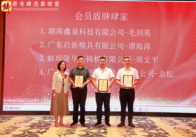 梁詩雅女士代表總會為四家永久會員企業(yè)代表頒發(fā)了證書和盾牌,分別為湖南鑫泉科技有限公司、廣東啟新模具有限公司、蚌埠隆華壓鑄機有限公司、廣東賽宏精密清洗裝備有限公司。